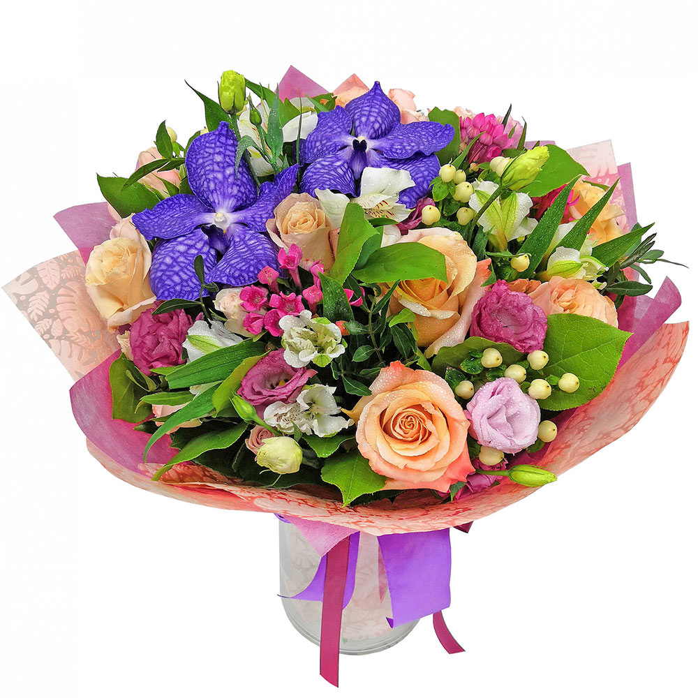 Ванда (орхидея), альстромерия белая, гиперикум, роза одноголовая персиковая, эустома розовая, эвкалипт. Упаковка (лента, пленка, крафт, сетка, пленка матовая)
