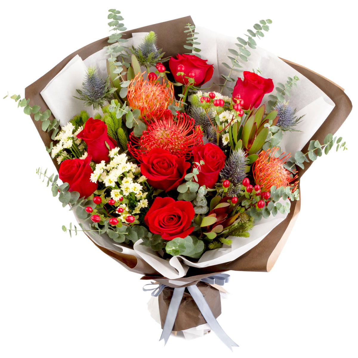 Роза одноголовая красная, леукосперум (протея), гиперикум, эрингиум, хризантемы мини, эвкалипт. Упаковка (лента, пленка, крафт, сетка, пленка матовая)