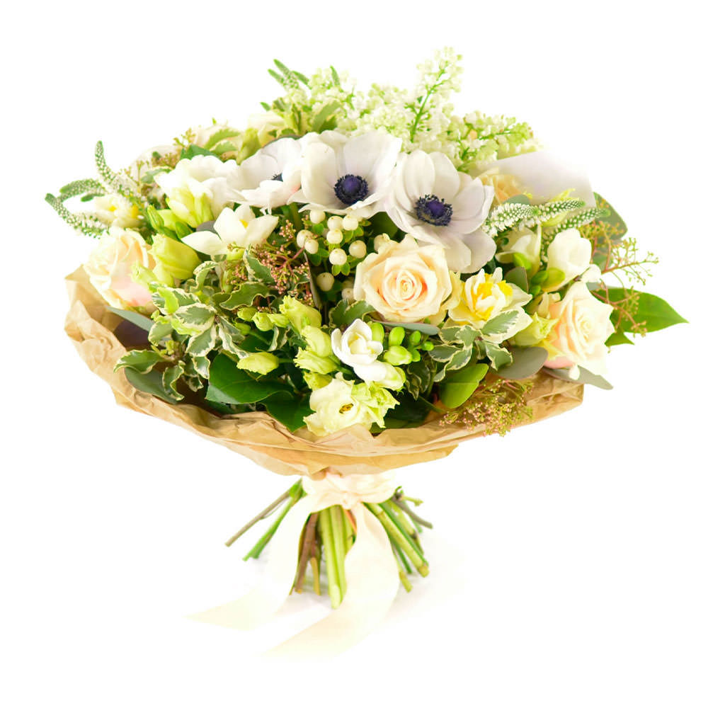 Роза одноголовая кремовая, фрезия белая, гиперикум, вероника, анемон белый, сирень белая, эвкалипт. Упаковка (лента, пленка, крафт, сетка, пленка матовая)