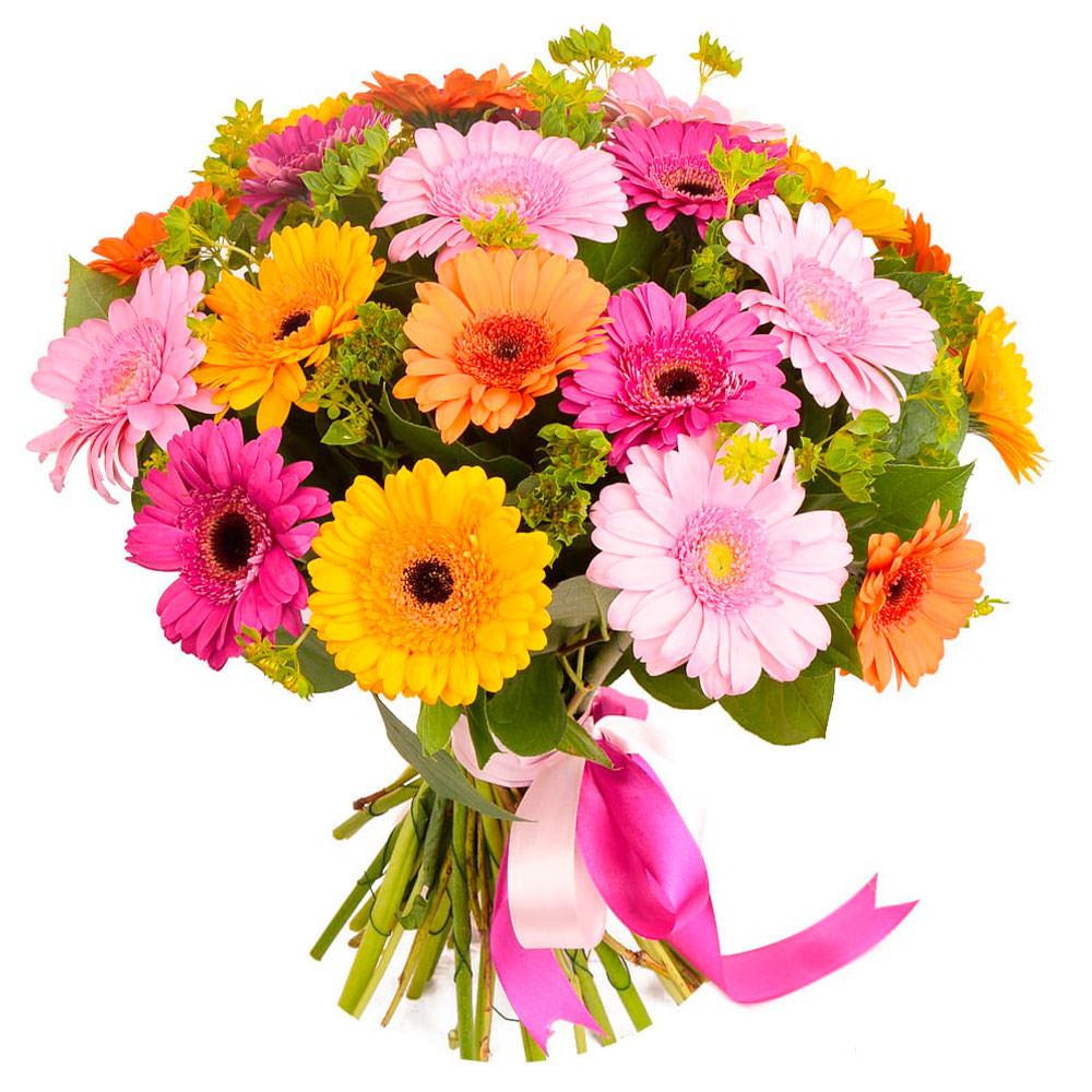 Гербера микс (желтая, оранжевая, розовая, сиреневая), зелень. Упаковка (лента, пленка, крафт, сетка, пленка матовая)