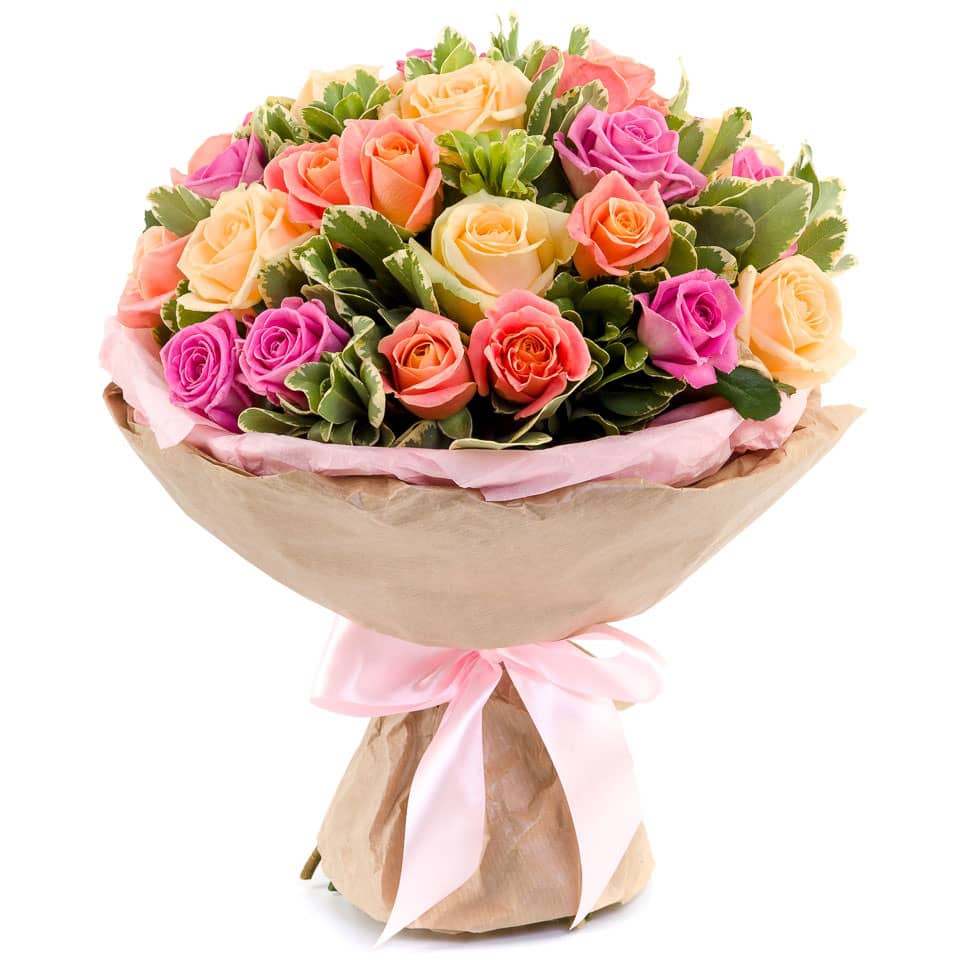 Роза одноголовая микс Россия/Кения (желтая, персиковая, розовая), питтоспорум. Упаковка (лента, пленка, крафт, сетка, пленка матовая)