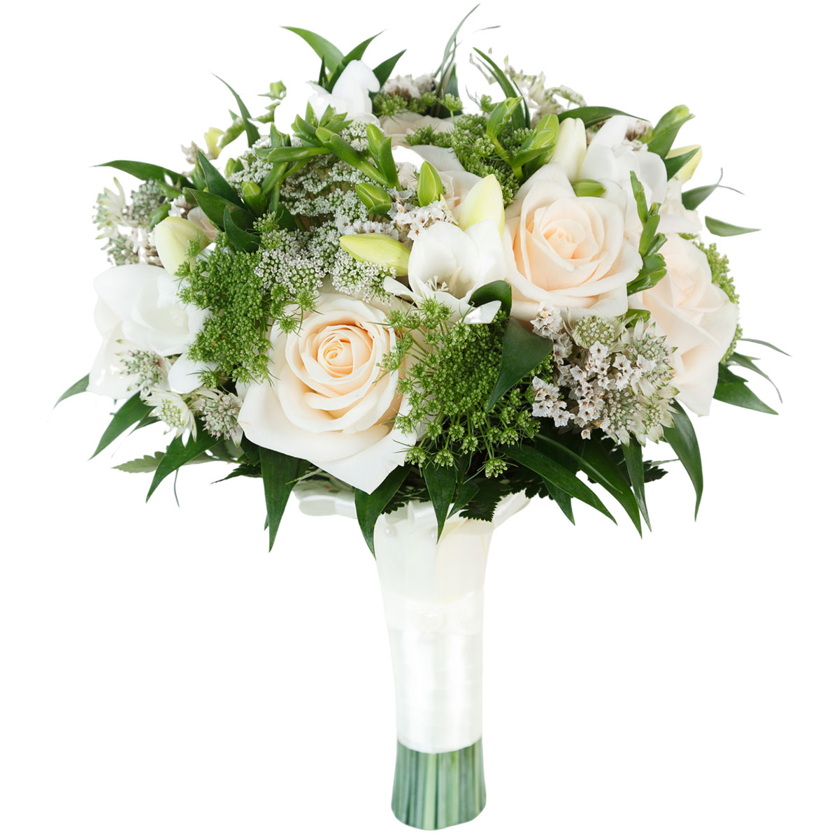 Роза одноголовая кремовая, лилия белая, амми, зелень. Упаковка (лента, пленка, крафт, сетка, пленка матовая)