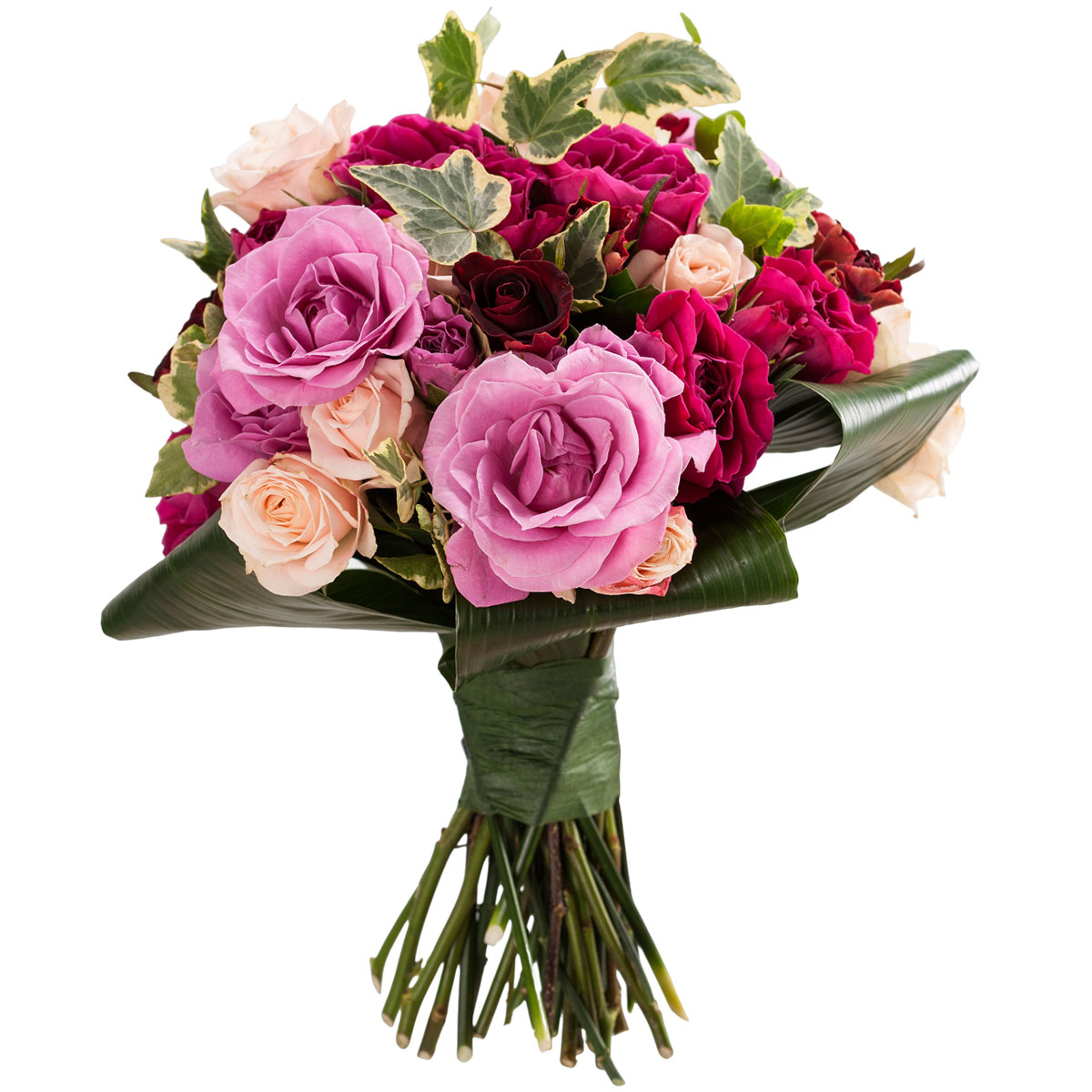 Роза одноголовая розовая, роза кустовая кремовая, розовая и красная, аспидистра, плющ. Упаковка (лента, пленка, крафт, сетка, пленка матовая)