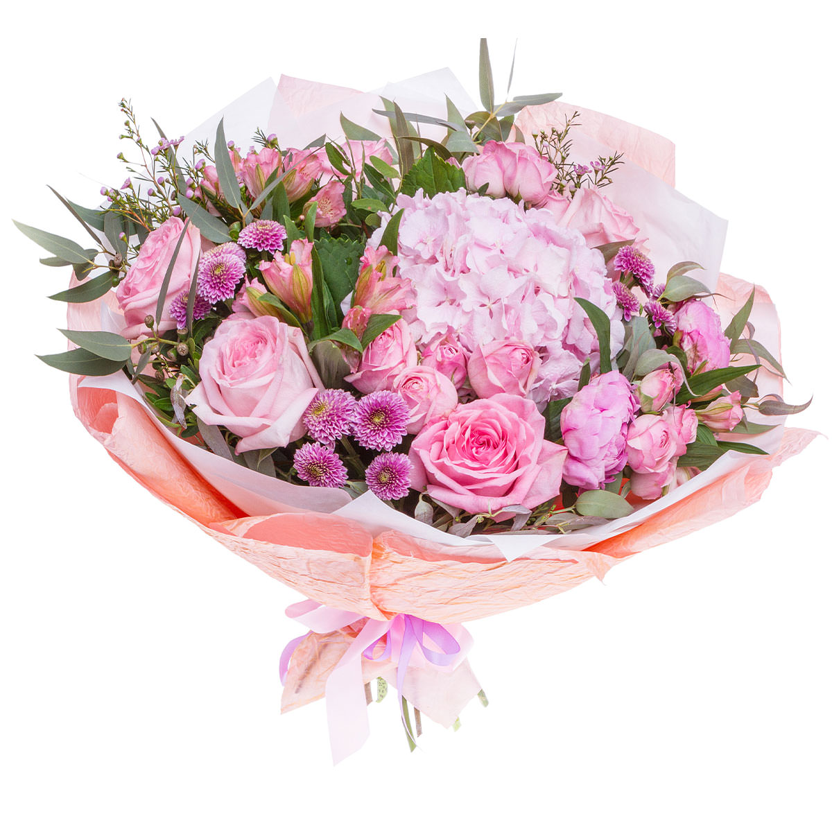 Гортензия розовая, роза одноголовая розовая, хризантема мини кустовая розовая, альстромерия розовая, роза пионовидная кустовая розовая, эвкалипт. Упаковка (лента, пленка, крафт, сетка, пленка матовая)