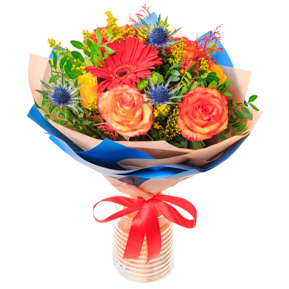 Роза одноголовая микс (оранжевая, желтая), гербера красная, фисташка, эрингиум, трахелиум. Упаковка (лента, пленка, крафт, сетка, пленка матовая)
