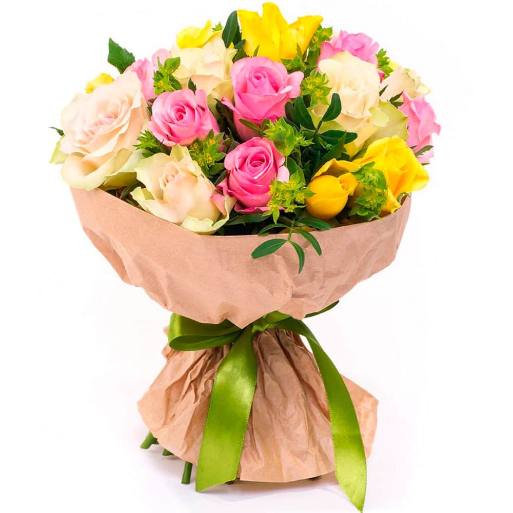 Роза одноголовая розовая, нежно-розовая и желтая, фисташка. Упаковка (лента, пленка, крафт, сетка, пленка матовая)