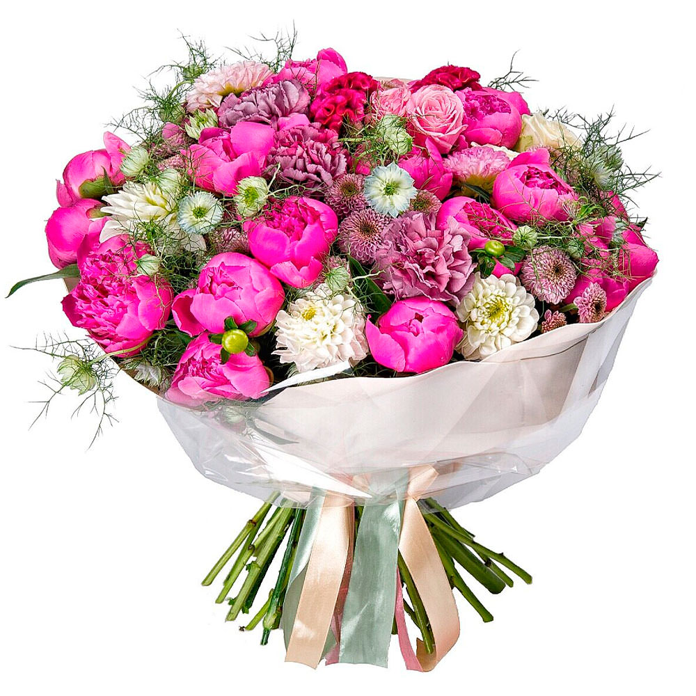 Пион розовый, гвоздика розовая, хризантема кустовая мини сиреневая, георгин белый, зелень. Упаковка (лента, пленка, крафт, сетка, пленка матовая)