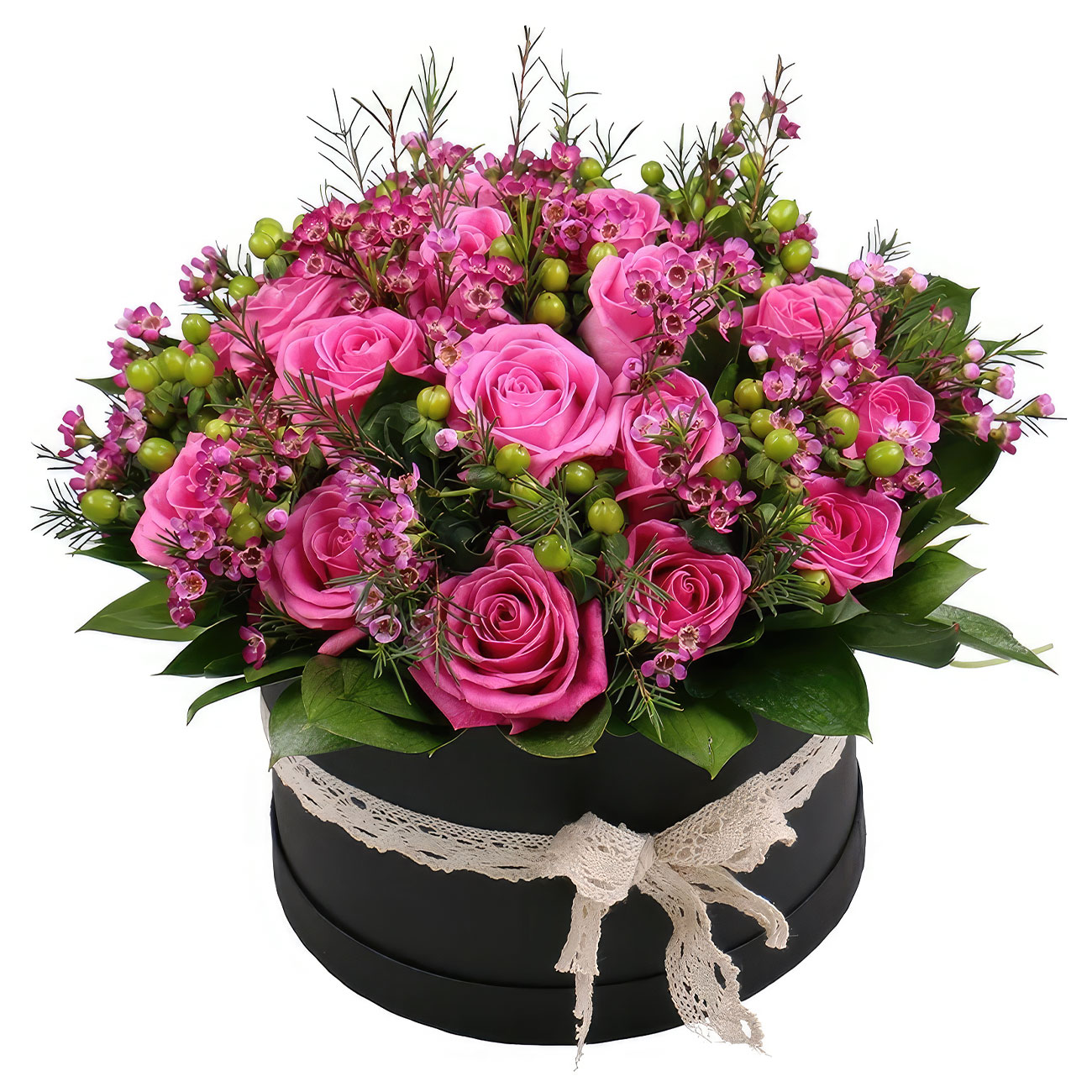 Роза одноголовая розовая, гиперикум, ваксфлауэр, зелень. Упаковка (шляпная коробка, квадратный бокс, коробка сердце, оазис)