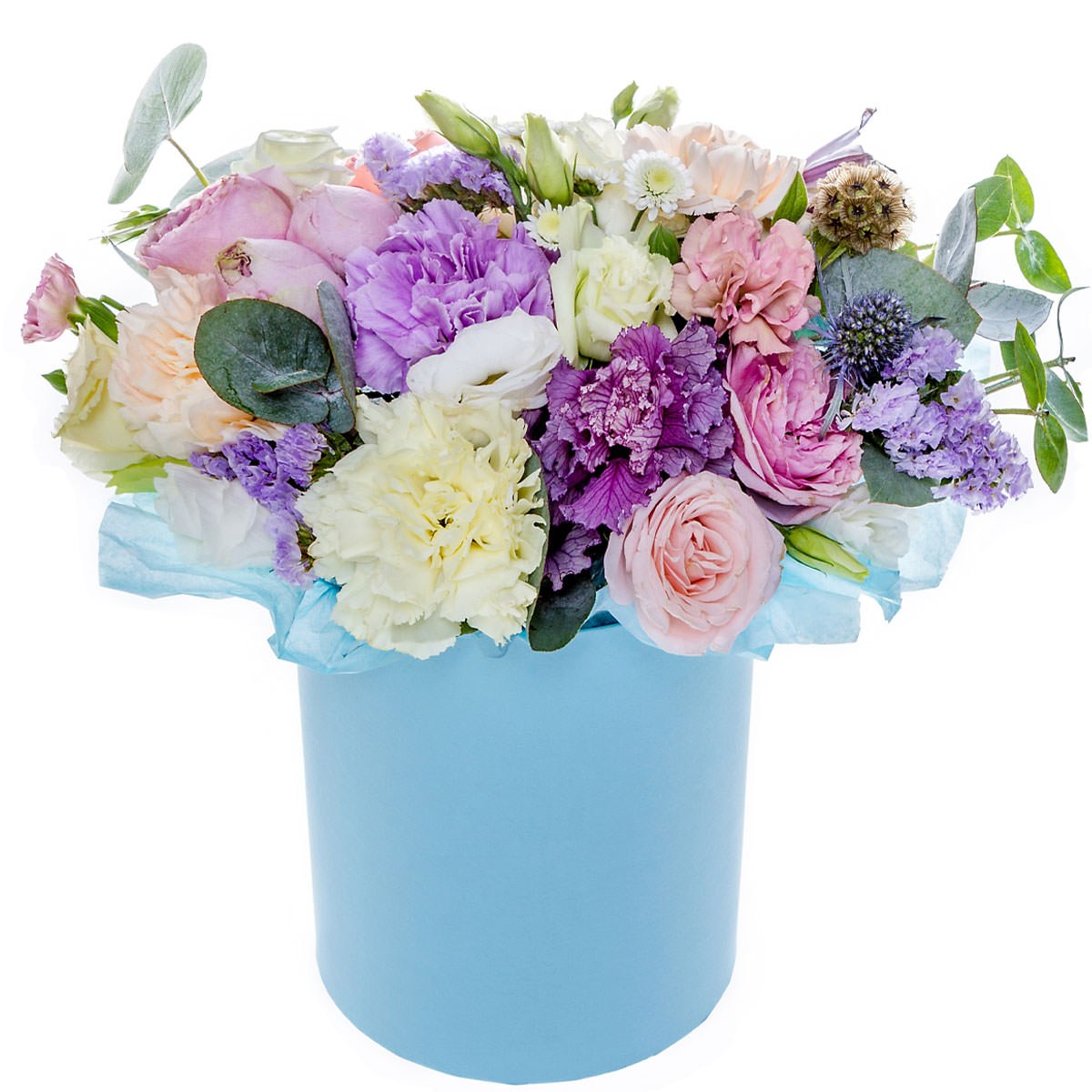 Гвоздика белая и сиреневая, роза пионовидная розовая, эустома белая, статица сиреневая, скабиоза сухоцвет, эрингиум, декоративная капуста, эвкалипт. Упаковка (шляпная коробка, квадратный бокс, коробка сердце, оазис)