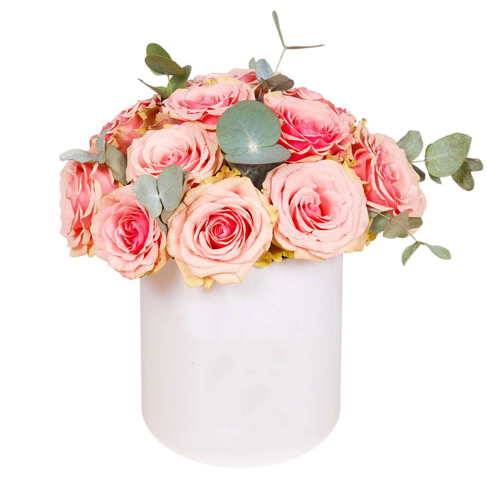 Роза одноголовая кремовая, эвкалипт. Упаковка (шляпная коробка, квадратный бокс, коробка сердце, оазис)